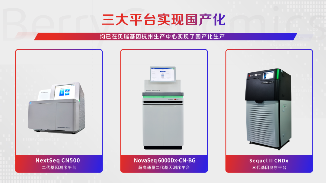 貝瑞基因目前打造了以NextSeq CN500、NovaSeq 6000Dx-CN-BG 以及 Sequel II CNDx 為代表的三大測序平臺。2019年,NextSeq CN500適用范圍變更獲得國家藥品監(jiān)督管理局批準(zhǔn),成為了適合大規(guī)模臨床基因檢測的NGS通用型平臺;Sequel II CNDx 已通過技術(shù)要求檢驗,目前處于醫(yī)療器械注冊申報中的臨床試驗階段;NovaSeq 6000Dx-CN-BG目前處于注冊檢驗階段。自2021年起,三大平臺均已在貝瑞基因杭州生產(chǎn)基地落地生產(chǎn),實現(xiàn)了真正意義上的國產(chǎn)化。