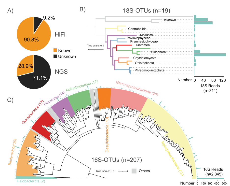基于HiFi reads的分類分辨率。(A) HiFi和NGS讀數具有(已知)/不具有(未知)分類信息的百分比。(B和C)基于19個全長18S-OTUs (B)和207個全長16S-OTUs (C)的系統進化樹