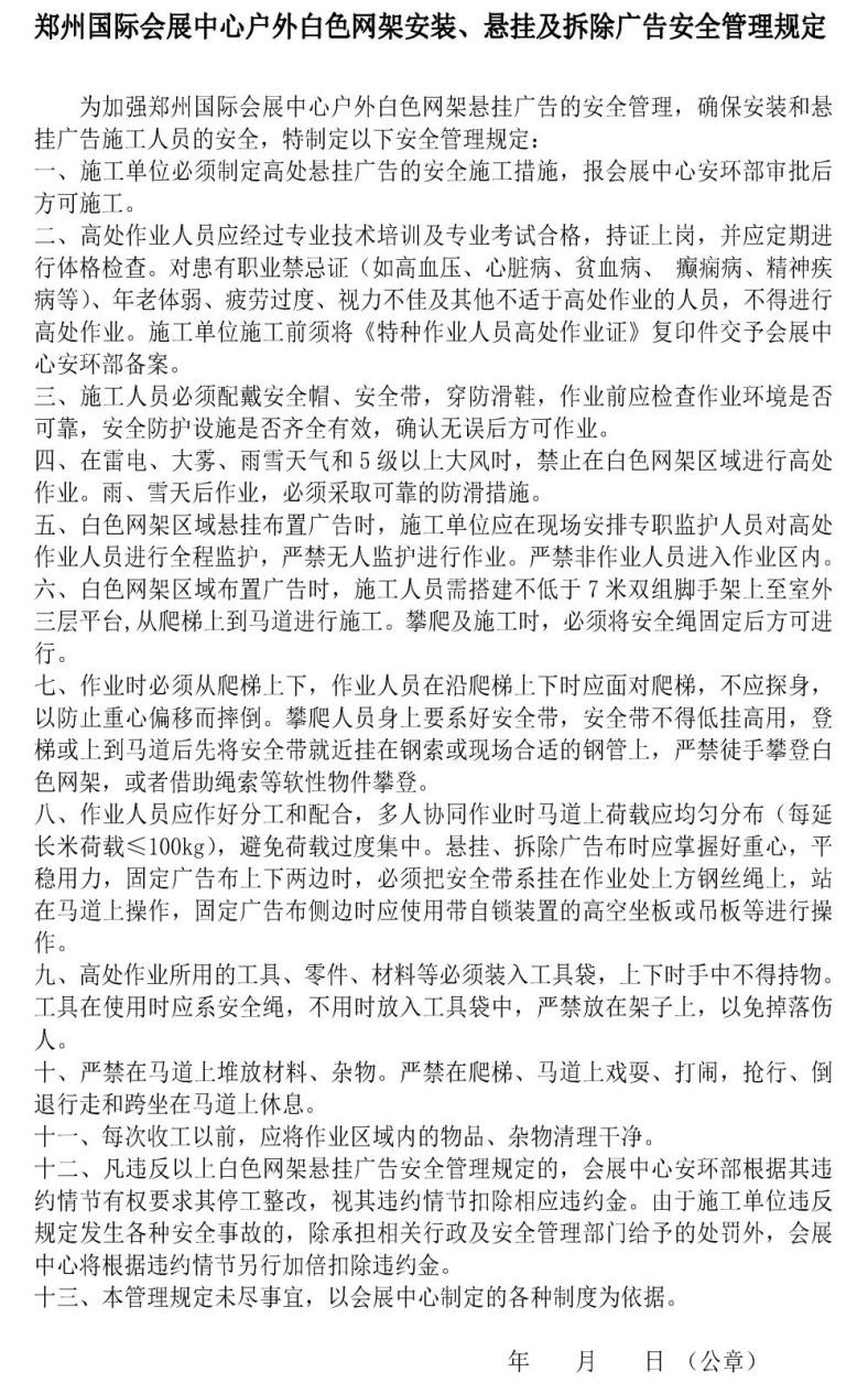 首頁(yè)服務(wù)指南下載中心文章詳情 文章詳情 戶外白色網(wǎng)架安裝、懸掛及拆除廣告安全管理規(guī)定 鄭州國(guó)際會(huì)展中心戶外白色網(wǎng)架安裝、懸掛及拆除廣告安全管理規(guī)定 《鄭州國(guó)際會(huì)展中心戶外白色網(wǎng)架安裝、懸掛及拆除廣告安全管理規(guī)定》文檔下載