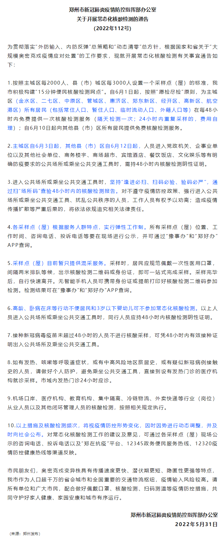 【轉(zhuǎn)載】鄭州市新冠肺炎疫情防控指揮部辦公室關(guān)于開展常態(tài)化核酸檢測的通告