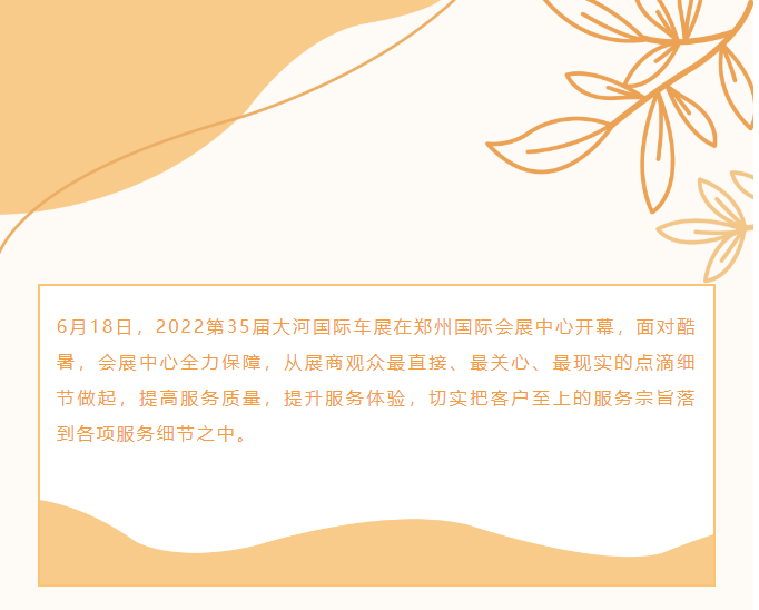 6月18日,2022第35屆大河國(guó)際車(chē)展在鄭州國(guó)際會(huì)展中心開(kāi)幕,面對(duì)酷暑,會(huì)展中心全力保障,從展商觀(guān)眾最直接、最關(guān)心、最現(xiàn)實(shí)的點(diǎn)滴細(xì)節(jié)做起,提高服務(wù)質(zhì)量,提升服務(wù)體驗(yàn),切實(shí)把客戶(hù)至上的服務(wù)宗旨落到各項(xiàng)服務(wù)細(xì)節(jié)之中。