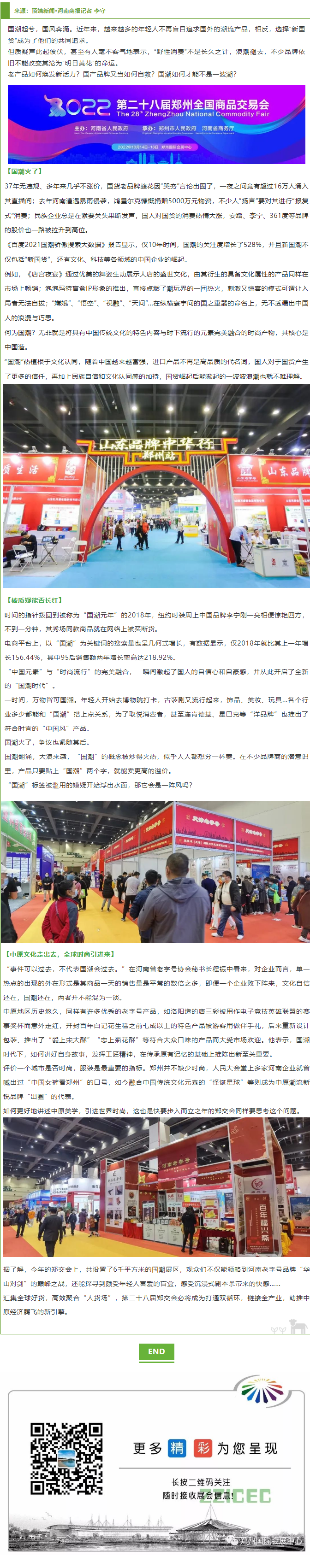 首頁新聞中心展會新聞文章詳情 文章詳情 傳統(tǒng)與潮流碰撞!看鄭交會如何玩轉(zhuǎn)“新國潮” 國潮起兮,國風(fēng)奔涌。近年來,越來越多的年輕人不再盲目追求國外的潮流產(chǎn)品,相反,選擇“新國貨”成為了他們的共同追求。 但質(zhì)疑聲此起彼伏,甚至有人毫不客氣地表示,“野性消費(fèi)”不是長久之計,浪潮褪去,不少品牌依舊不能改變其淪為“明日黃花”的命運(yùn)。 老產(chǎn)品如何煥發(fā)新活力?國產(chǎn)品牌又當(dāng)如何自救?國潮如何才能不是一波潮?