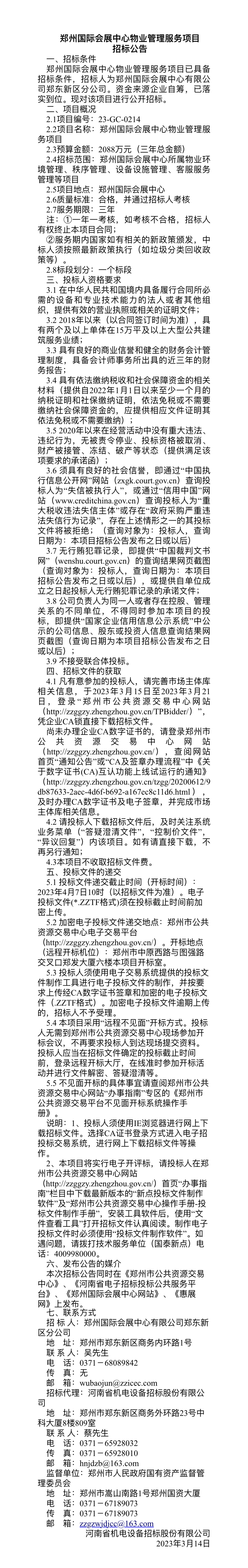 鄭州國際會展中心物業(yè)管理服務項目 招標公告