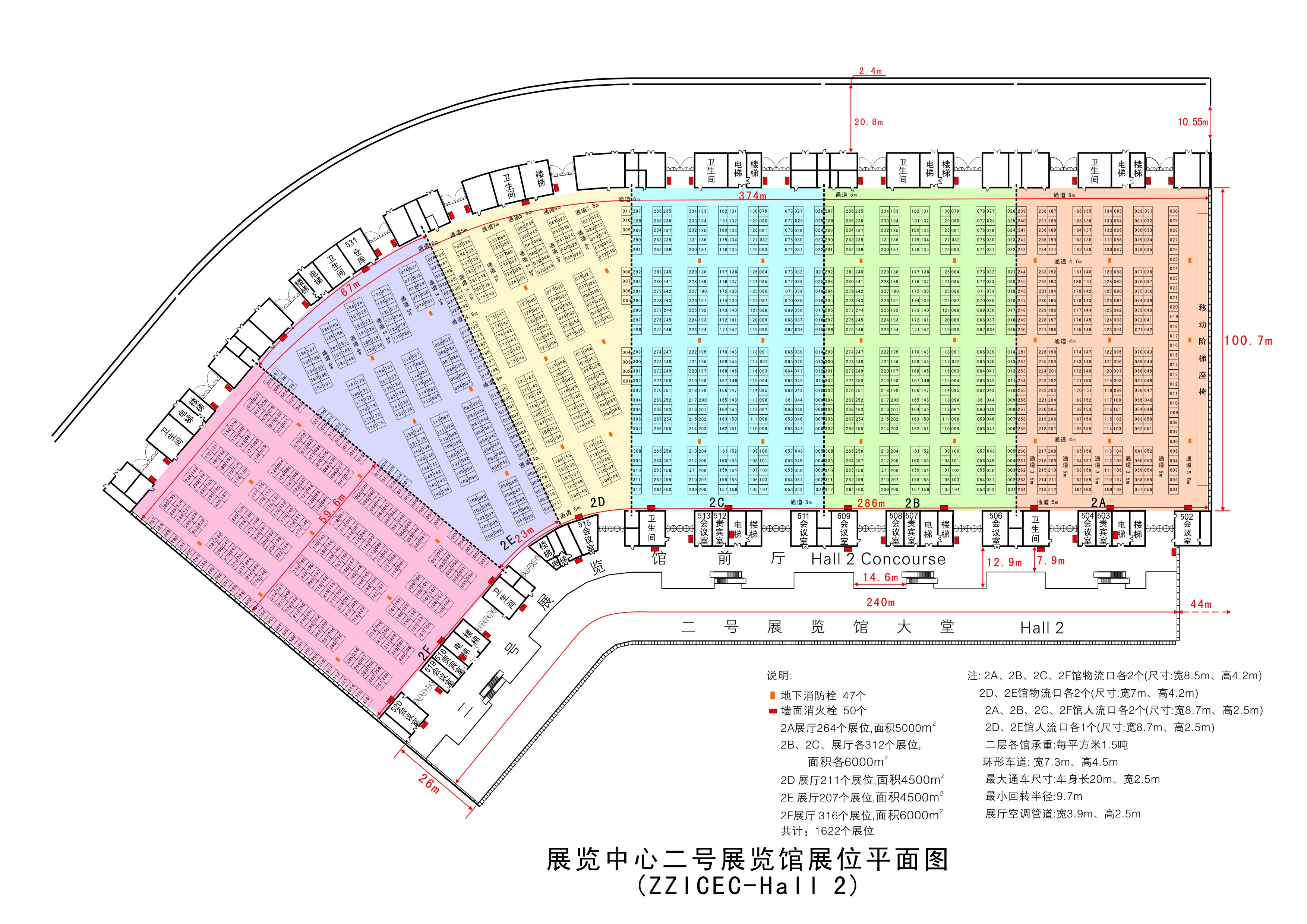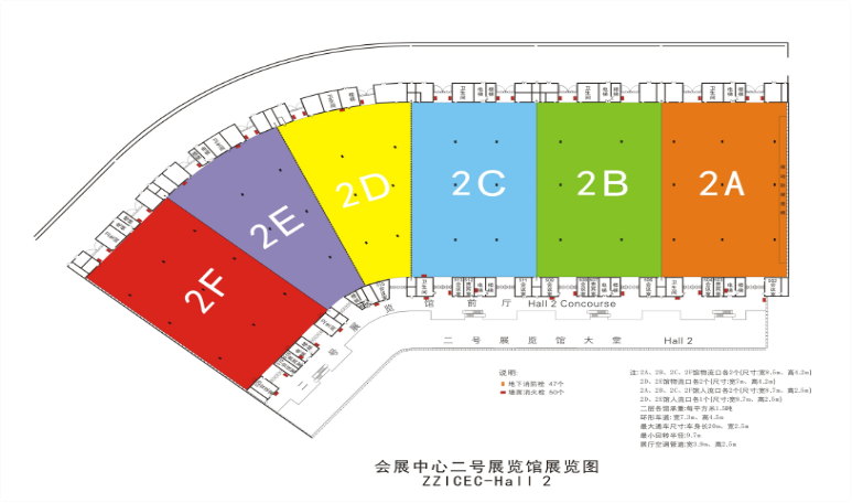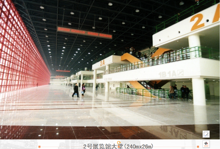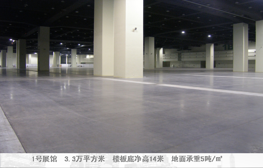 1號展館3.3萬平方米,1772個標準展位,凈高14米,地面承重5噸/㎡; 2號展館 3.2萬平方米 ,1622個標準展位 ,凈高17.6米 地面承重1.5噸/㎡ ; 三層連廊(240mx26m),室外展場 3.8萬平方米, 停車場4.5萬平方米,設1800個停車位。