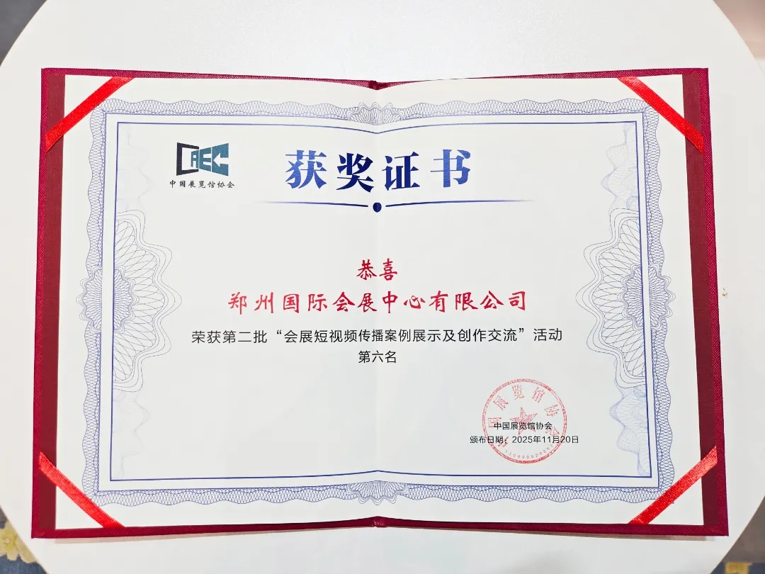 鄭州國際會展中心有限公司榮獲第二批“會展短視頻傳播案例展示及創(chuàng)作交流”活動第六名